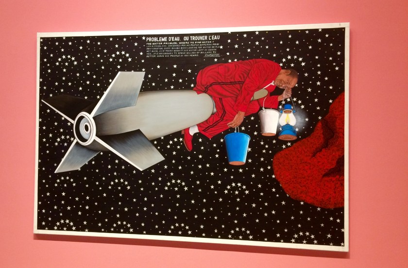 Activist Chéri Samba is inspired by everyday life and touches on a wide range of subjects from current political, economic, social and cultural events in Kinshasa – such as ecological problems, corruption, tragic events, etc. He incorporates text in his work, both in French and Lingala, as in the painting below, which highlights the problem of obtaining clean water.