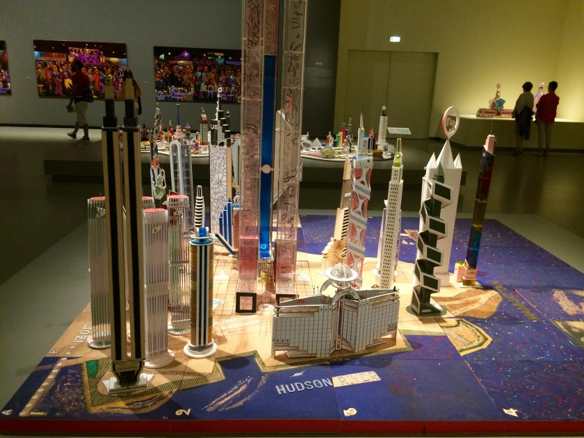 Bodys Isek Kingelez, who is from the Democratic Republic of the Congo, builds models of buildings with unusual shapes and bright colors, using recovered materials. Some are individual constructions, and some entire urban simulations, such as his enchanting rendering of an imaginary Manhattan, below.