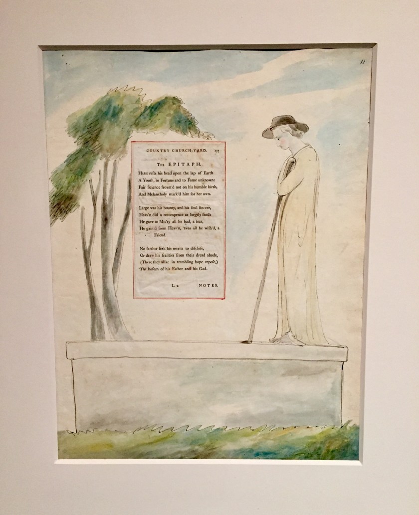 Blake must have had fantastic eyesight to be able to spend hours writing out his poems in minute script before illuminating them. Blake also illustrated other people’s work, such as Thomas Grey’s lovely ‘Elegy written in a country churchyard’.