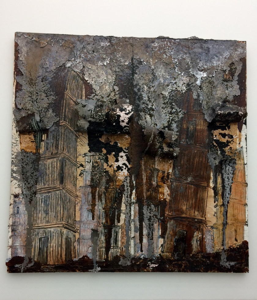 Kiefer is a romantic, with a huge visual vocabulary. He uses architecture, amongst other images, to convey the weight of history. The three paintings in the room are diptychs, large canvases whose surface is multi-layered and textured. Thick layers of gesso and paint have been mixed with other substances such as glass and clay to give them texture. Kiefer then scratches and carves into the surface to reveal the layers beneath. In these particular paintings, molten lead has been splattered on top, and parts of it have been bent and curled backwards to add a third dimension.