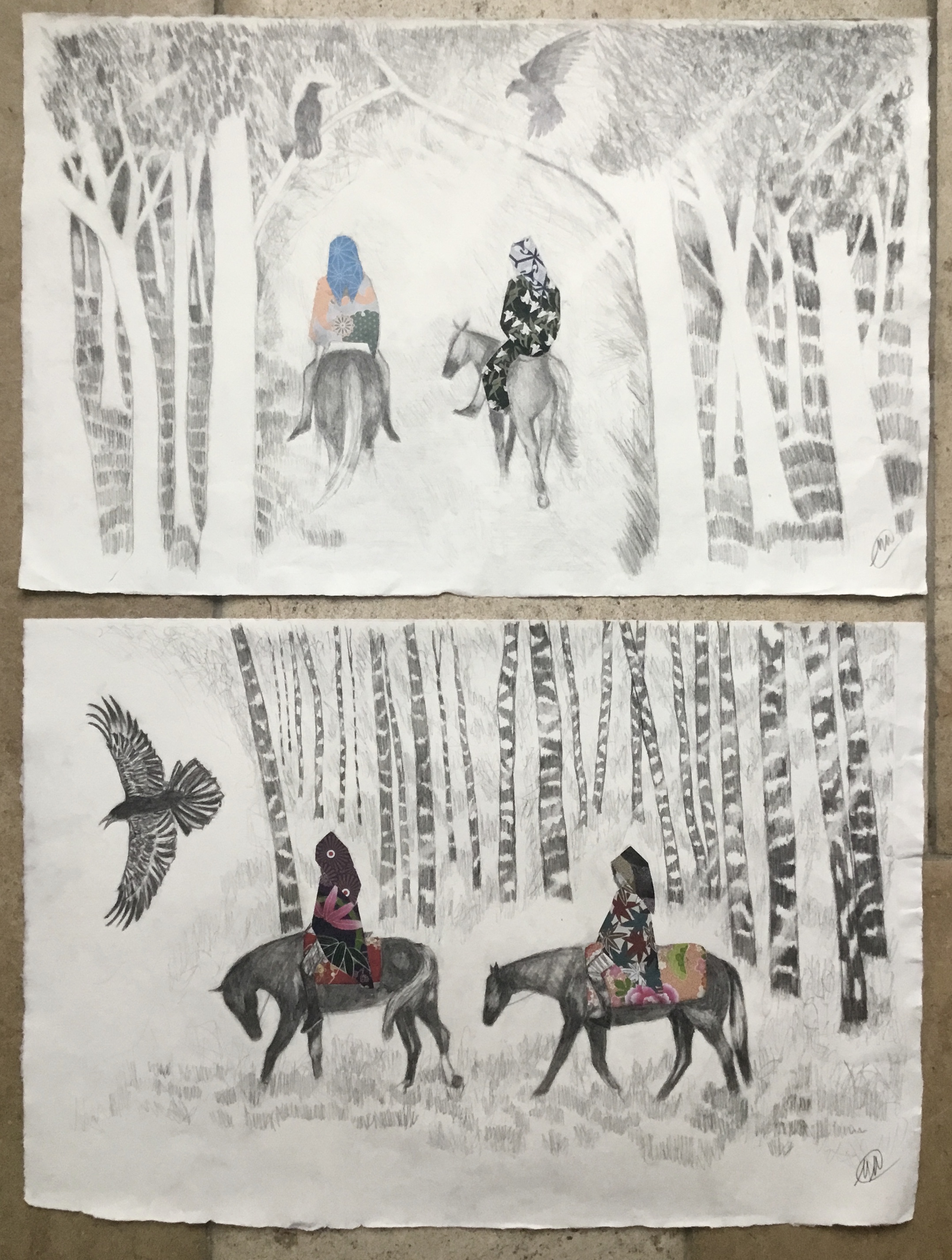 Travellers series. Pencil and collage on khadi paper