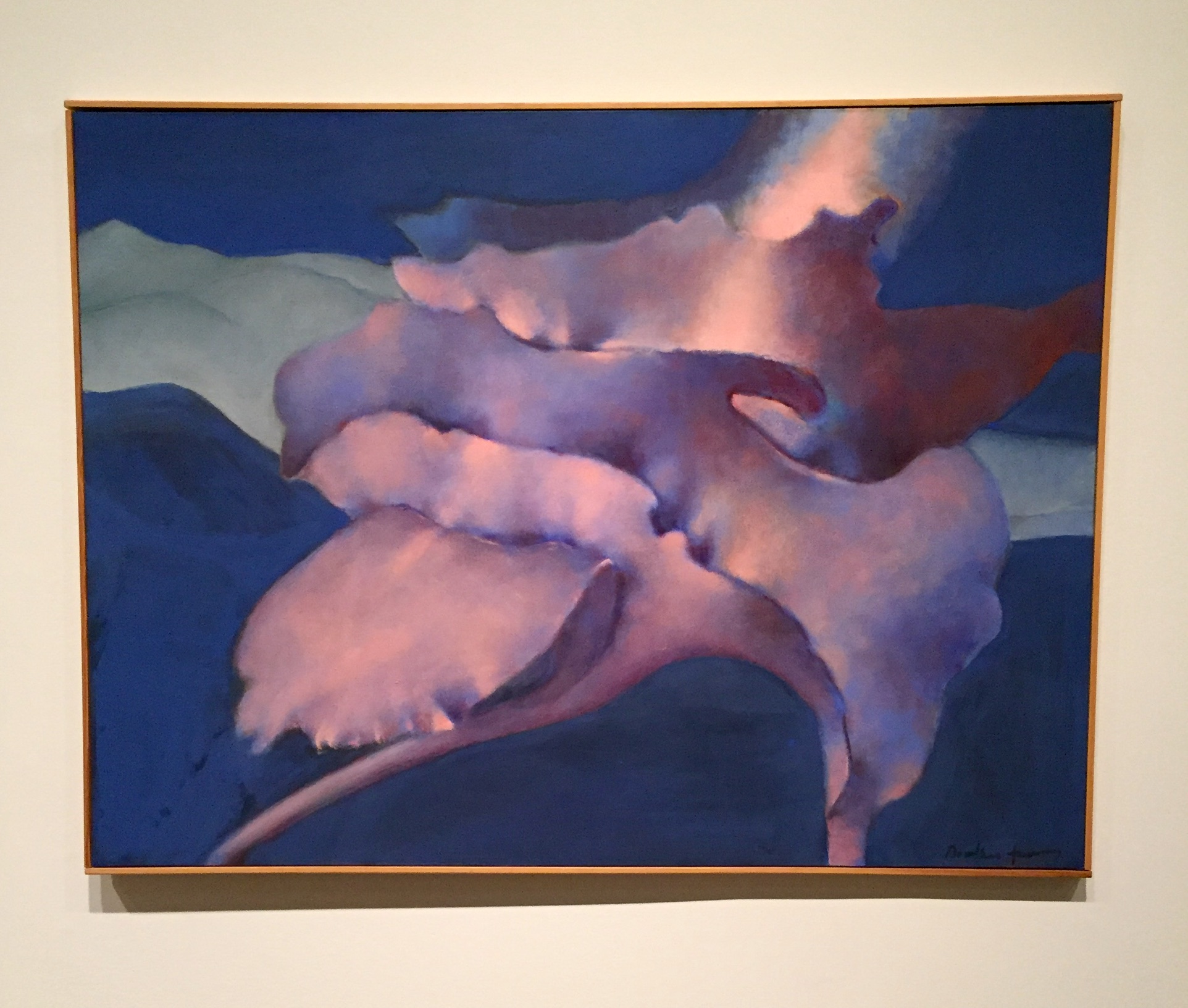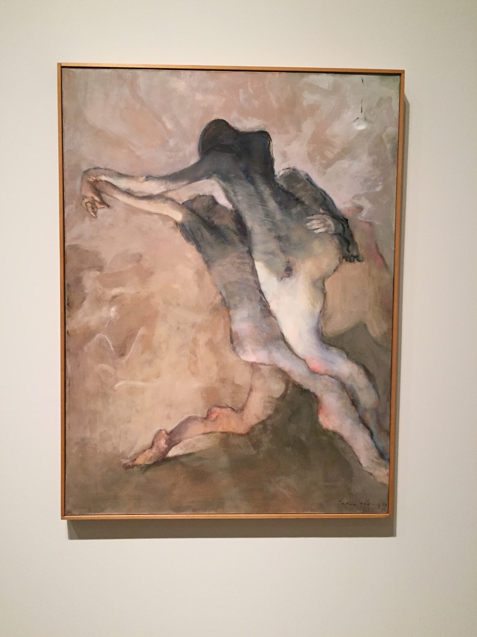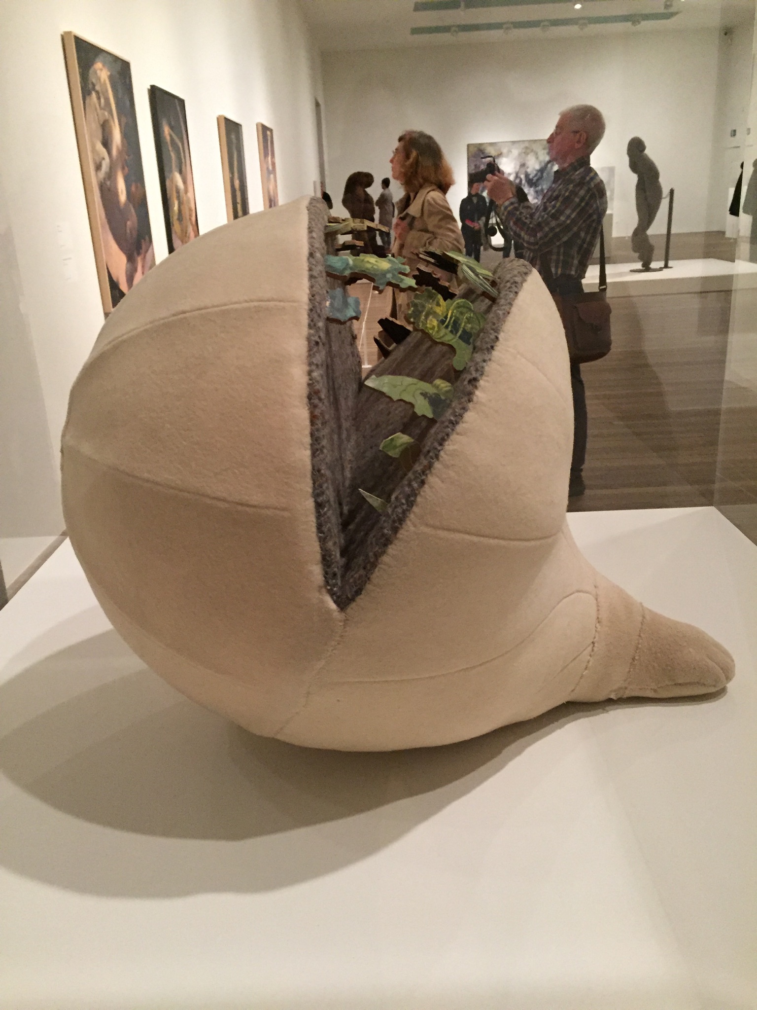 I watched a video of her, in late middle age. She wore a skirt and heels, had an apron tied about her waist, and could have been preparing dinner for friends. But she was not, she was putting bold strokes of black paint onto a canvas twice as tall as herself and as wide as her studio wall. She was a comfortable shape, and had a comfortable, smiling face. You can tell she’s enjoying herself. Later, she’s sewing some pink material to make one of her crazy soft sculptures. Her hands are freckled, she pushes the stuffing about. Then she shoves a bunch of the sculptures down the stairs, her little Lhasa Apso dogs running around, yapping.