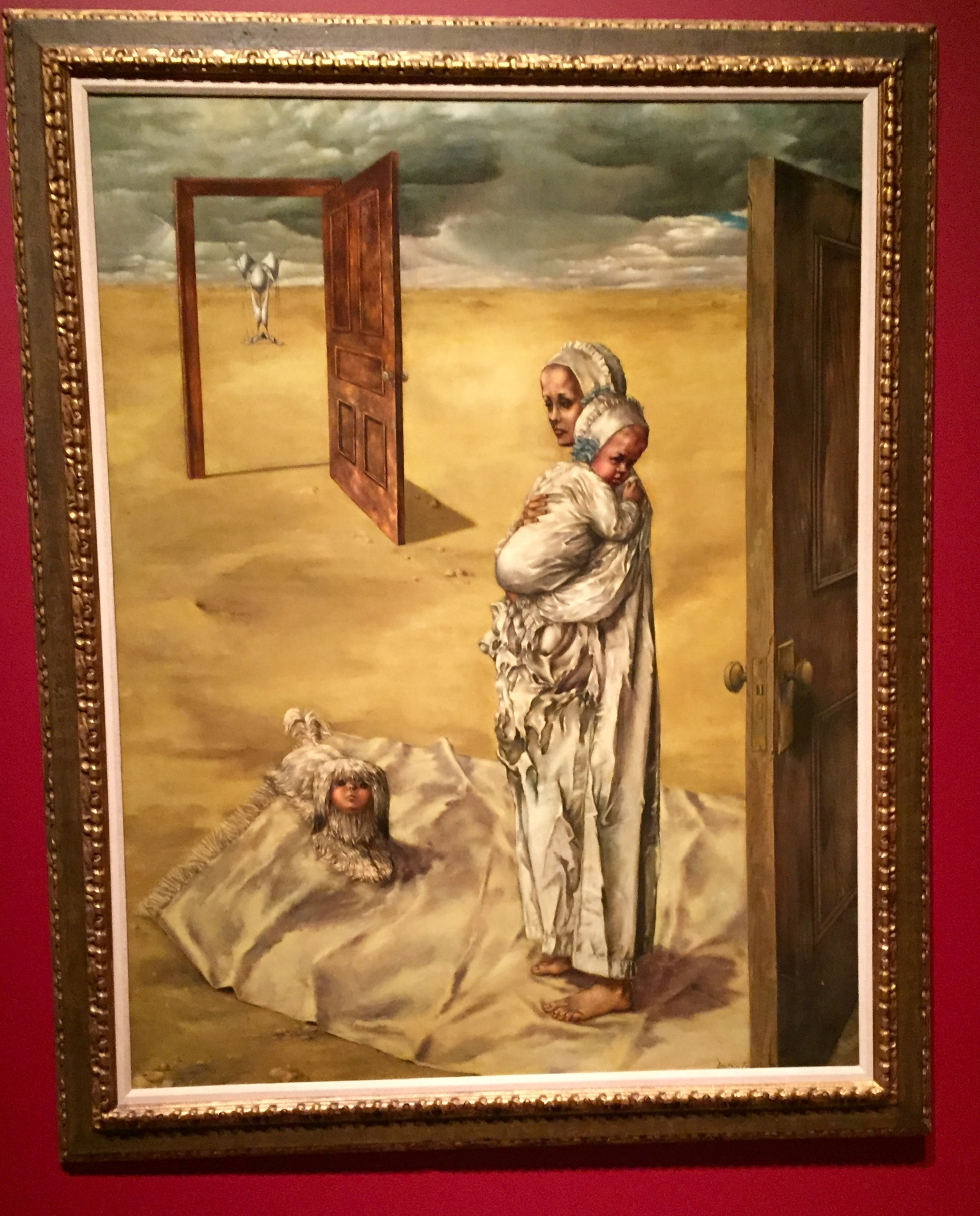 Tanning wanted to depict ‘unknown but knowable states’: to suggest there was more to life than meets the eye. Her paintings combine the familiar with the strange, exploring desire and sexuality. They are bursting with incongruous, amusing detail, such as little dogs based on the Lhasa Apso belonging to her husband, with his moustache, bulging eyes and sometimes human face. The painting below is entitled ‘Motherhood.’